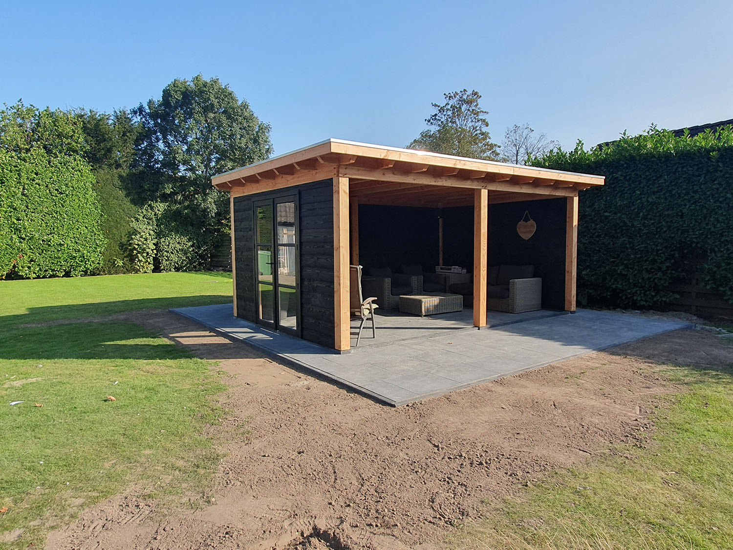Overkapping geplaats in NieuwendijkDit betreft een op maat gemaakte vrijstaande overkapping met aan de achterzijde een kleine berging welke is voorzien van een schuifdeur. Afmetingen overkapping 5,5 x 4 meter en de berging 4x1,5 meterAlle projectenDirect contactBel 06-11 44 84 99