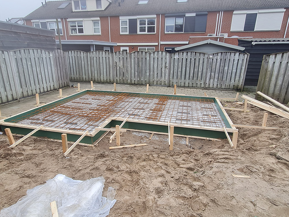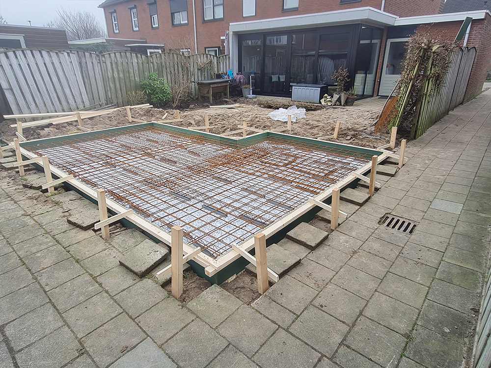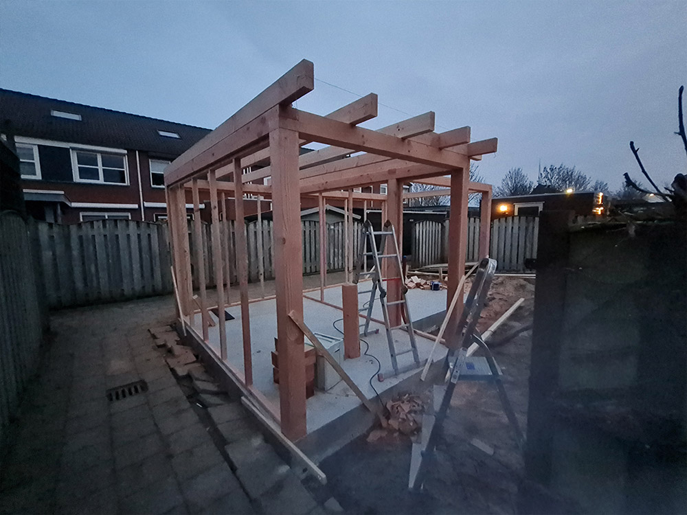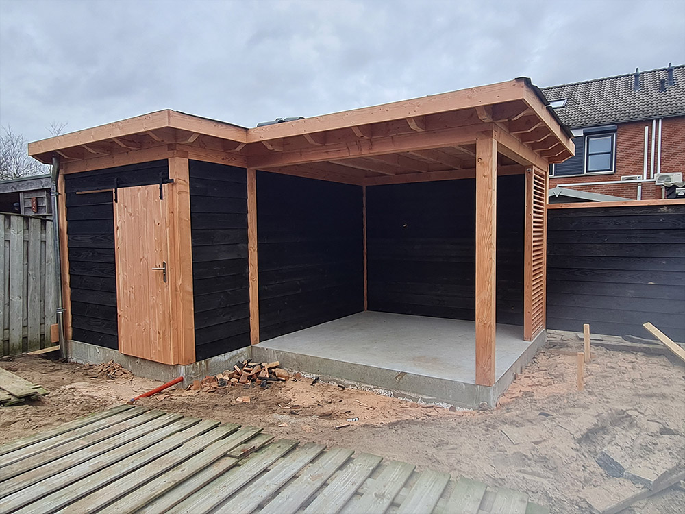 L-vorm overkapping met betonvloer en schuifdeur